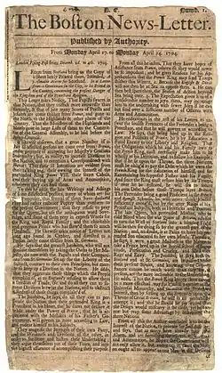 The Boston News-Letter, first published on April 24, 1704, is regarded as the first continuously published newspaper in the colony of Massachusetts. It was heavily subsidized by the British government, with a limited circulation. All copies were approved by the Royal governor before publication.[1] The colonies’ first newspaper was Publick Occurrences Both Forreign and Domestick, which published its first and only issue on September 25, 1690. In 1718, the Weekly Jamaica Courant[2] followed in Kingston. In 1726 the Boston Gazette began publishing with Bartholomew Green, Jr., as printer.