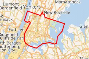 The Bronx (/brɒŋks/) is a borough of New York City, coextensive with Bronx County, in the U.S. state of New York, the third-most-densely populated county in the United States.[4] It is south of Westchester County; northeast and east of Manhattan, across the Harlem River; and north of Queens, across the East River. The Bronx has a land area of 42 square miles (109 km2) and a population of 1,418,207 in 2019.[1] Of the five boroughs, it has the fourth-largest area, fourth-highest population, and third-highest population density.[4] It is the only borough predominantly on the U.S. mainland. If each borough were its own city, the Bronx would rank as the eighth-most-populous in the U.S.