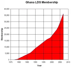 In 2018, the LDS Church reported having 78,065 members, along with 4 missions, 51 family history centers, and 303 congregations in Ghana.[13]