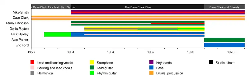 - Dave Clark – backing and occasional lead vocals, drums (1959–1970; 1970–1972, Dave Clark and Friends spinoff group)[7][21]