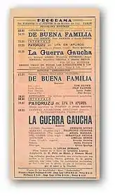 The Gaucho War (La guerra gaucha) is a 1942 Silver Condor award-winning Argentine historical drama and epic film directed by Lucas Demare and starring Enrique Muiño, Francisco Petrone, Ángel Magaña, and Amelia Bence. The film's script, written by Homero Manzi and Ulyses Petit de Murat, is based on the novel by Leopoldo Lugones published in 1905. The film premiered in Buenos Aires on November 20, 1942 and is considered by critics of Argentine cinema to be one of the most successful films in history.[1] It won three Silver Condor awards, including Best Film,[2] Best Director (Lucas Demare),[3] and Best Adapted Screenplay (Ulises Petit de Murat and Homero Manzi),[3] given by the Argentine Film Critics Association at the 1943 Argentine Film Critics Association Awards for the best films and performances of the previous year.