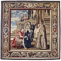 The History of Constantine is a series of tapestries designed by Flemish artist Peter Paul Rubens and Italian artist Pietro da Cortona depicting the life of Constantine I, the first Christian emperor of Ancient Rome. In 1622, Rubens painted the first twelve oil sketches that were used as guides, and the tapestries themselves were woven in the workshop of Marc Comans and François de la Planche in the Faubourg Saint-Marcel in Paris by 1625,[1] transforming each small sketch (perhaps two feet per side) into a sumptuous creation of wool, silk, and gold and silver threads that could easily fill a wall.[2] An additional five designs were painted by Cortona in 1630 and woven in the atelier of Cardinal Francesco Barberini in Rome over the next decade.[3]