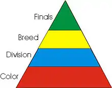 The cat show competition is structured like a pyramid. First, all of the entries are divided into their respective classes.[8] Within each of these classes, cats are called to the judging ring according to breed, division and color/pattern.[9]
