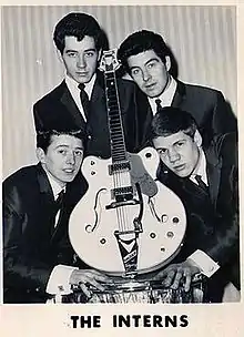 In 1964, under the guidance of musical instrument entrepreneur Ivor Arbiter, they morphed into The Interns, picking up another guitarist, Mike Parker (from Walthamstow), which gave the impetus for a name change. The group was managed by the Tito Burns Agency who also managed, Dusty Springfield and The Searchers, amongst others, and recorded for Philips Records.[3] As a result, the band often appeared on the same bill as these artists. For example, on Sunday 23 August 1964, The Interns appeared on the third and last of three Sunday concerts organised by the promoter, Arthur Howes.[4] Dusty Springfield topped the bill, which also featured Eden Kane as well as The High Numbers, who would soon become The Who.