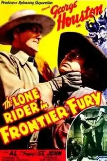 The Lone Rider in Frontier Fury is a 1941 American film directed by Sam Newfield. The film stars George Houston as the "Lone Rider" and Al St. John as his sidekick "Fuzzy" Jones, with Hillary Brooke, Karl Hackett, Ted Adams and Arch Hall Sr. The film was released on August 8, 1941, by Producers Releasing Corporation.[1][2][3] The film is also known as Frontier Fury in the United Kingdom and Rangeland Racket (American reissue title).