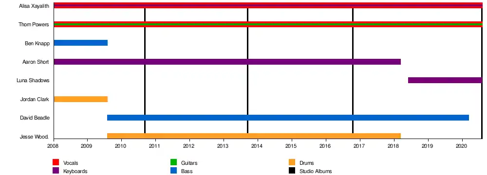 The band formed in 2008 when Thom Powers and Alisa Xayalith were working on what formed two extended plays—This Machine and No Light—that they recorded with engineer Aaron Short, a fellow student at Auckland's Music and Audio Institute of New Zealand.[11][1] The EPs were subsequently released on local independent label Round Trip Mars. Powers and Xayalith began performing live with Ben Knapp and Jordan Clark on bass and drums respectively, while Aaron Short became a performing member of the group. Knapp and Clark left the group in 2009 and were subsequently replaced with Jesse Wood and David Beadle.