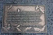 Germaine Brée has characterised the struggle of the characters against the plague as "undramatic and stubborn", and in contrast to the ideology of "glorification of power" in the novels of André Malraux, whereas Camus' characters "are obscurely engaged in saving, not destroying, and this in the name of no ideology".[6] Lulu Haroutunian has discussed Camus' own medical history, including a bout with tuberculosis, and how it informs the novel.[7] Marina Warner has noted the lack of female characters and the total absence of Arab characters in the novel, but also notes its larger philosophical themes of "engagement", "paltriness and generosity", "small heroism and large cowardice", and "all kinds of profoundly humanist problems, such as love and goodness, happiness and mutual connection".[8]