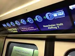 Inside the trains, color video displays provide station information in eight languages (English, French, German, Spanish, Japanese, Chinese, Arabic, and Korean) as well as information about dining and shopping options in the concourses. The original displays were English text-only dot-matrix red-LED displays, replaced before the Olympics with larger ones having a smaller dot pitch (and therefore higher resolution) capable of showing eastern Asian CJK characters.