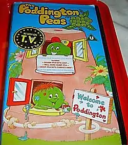 The Poddington Peas is a British animated television series that was created by Paul Needs and Colin Wyatt of Cairnvale Productions for Poddington PLC; it has thirteen five-minute episodes, and was aired on BBC One as part of the Children's BBC strand (as it had been known from its inception on 9 September 1985 until 4 October 1997) from 14 September to 22 December 1989.[1] The series' theme song, composed by Geoff Stephens, describes the eponymous group of Peas living "down at the bottom of the garden". Human-sized garden objects, enormous in size to the Peas, are often seen, such as upturned flowerpots which serve as most of their buildings. Humans themselves are never seen or mentioned (with the single exception of mythical Christmas gift-giver Santa Claus, who left his gifts at Creepy Castle in the last episode). All thirteen episodes were released on VHS by Palace Video in 1990 (HPV0018), but this is now out of print. As with the majority of other older BBC children's series, it has also never made it to DVD.