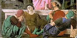 The guard holding the lance is depicted sitting in an anatomically impossible pose, and appears to have no legs. Piero probably left them out so as not to break the balance of the composition.[7]