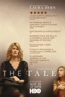 The Tale is a 2018 American drama film written and directed by Jennifer Fox and starring Laura Dern, Ellen Burstyn, Jason Ritter, Elizabeth Debicki, Isabelle Nélisse, Common, Frances Conroy, and John Heard. It tells the story about Fox's own childhood sexual abuse and her coming to terms with it in her later life. It premiered at the 2018 Sundance Film Festival[1][2] and aired on HBO on May 26, 2018.[3]