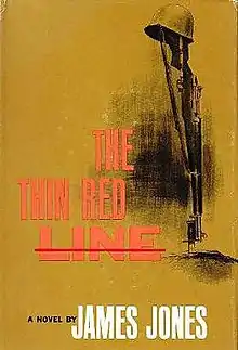 The Thin Red Line, originally published in September 1962,[2] shares its central characters with Jones's other two World War II novels, though with their names necessarily altered, and examines their different reactions to combat. Jones had originally intended the central male characters of his previous war novel From Here to Eternity to appear in this work. But Jones remarked that "the dramatic structure—I might even say the spiritual content—of the first book demanded that Prewitt be killed at the end of it". Jones tackled the problem by changing the names of the three characters of the first novel, enabling them to appear in The Thin Red Line. The character of Prewitt became Witt, Warden became Welsh and Stark became Storm.[2] (Jones' later novel Whistle (1978), features a similar set of characters, now named Sergeant Mart Winch, Bobby Prell, and Johnny "Mother" Strange; Corporal Fife in The Thin Red Line also reappears as company clerk Marion Landers in Whistle.)