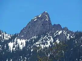 The Tooth is the descriptive name for a 5,604 ft, fin-like, andesite pillar located in King County of Washington state.[2] It is part of the Cascade Range and is within the Alpine Lakes Wilderness. The Tooth is located northwest of Snoqualmie Pass and the Alpental ski area on land managed by Mount Baker-Snoqualmie National Forest. The nearest higher peak is Bryant Peak, 0.44 miles (0.71 km) to the northwest.[1] Originally called Denny Horn and Denny Tooth, The Tooth became the officially recognized name in 1918, with Denny referring to its position on the high ridge between Denny Mountain and Chair Peak. The Tooth is a popular rock climbing destination, even in winter. The easiest route is class 4 scrambling, but solid rock provides technical routes, with the South Face considered a classic 5.4 climb that was first done in 1928 by Anderson and Wunderling.[3]