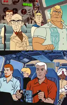 The series' principal reference is to the 1964 animated science fiction adventure television series Jonny Quest, as it is the basis for many of the main characters. Dr. Venture is modelled after what a child such as Jonny Quest might have grown up to be like after having lived through a childhood filled with bizarre, life-threatening events. Brock is modelled on Race Bannon. The Venture boys are based on the Hardy Boys and take the places of Jonny and Hadji. In the episode "Ice Station – Impossible!", Brock mentions that he had served with Race Bannon on several occasions. He regards his fellow agent with respect calling him "one of the best". One newspaper critic remarked, "If filmmakers Woody Allen and Sam Peckinpah had collaborated on Jonny Quest, it would have come out a lot like this."[23] In season 2, Jonny Quest was introduced into the show as Action Jonny, a homeless drug addict who deeply resents his father. As of season 4, Jonny is somewhat stable, and in a support group for former boy adventurers, along with Dr. Venture, the second Wonder Boy, RoBoy, and The Hale Brothers– the final three being parodies of Robin, Astro Boy, and The Hardy Boys respectively.[24]