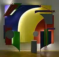 Pištěk's conceptual installation of sacred objects in the former riding school in Hluboká nad Vltavou had a dramatic gradation and scope, and within the context of postmodern scepticism it offered an updating of the psychological values of collectively valid myths.[18] On an altar in the foreground, which he titled Homage to Böcklin’s “Centaur Watching Fish”,[19] he placed the scoop of an excavator arching over a fish in a glass sphere. At the head of the riding school he installed an altar painting with an illusionistic landscape in the Baroque style, to which he added brightly coloured geometrical forms that quoted the American postmodernist Frank Stella. In front of this painting was a pyramid with a pile of refuse that was titled Reliquary. The side altars, hidden in a labyrinth, depicted the Crucifixion as the hanging chassis of a racing car and the Visitation made of an old petrol pump, with car doors as the angel's wings. According to Jiří Šetlík, Pištěk's subjective interpretation of our sick world unmasks our faith in consumerist idols.[20]