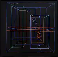 Pištěk's three-dimensional objects for his exhibition at the Prague City Gallery (1999) worked with the contrast between image and sound. Garden was a pavilion made of massive children's building blocks surrounded by a forest of hanging poles protecting the pavilion's privacy, with a soundtrack of whispered conversations too quiet to be heard. Next to Garden was Forest, a glass pyramid filled with fragments of wood and rubbish from fly tipping, together with romantic forest still lifes and a soundtrack of chainsaws and falling trees.[21] Other objects relate to Pištěk's film work and his racing career. At the entrance to his retrospective exhibition at the National Gallery in Prague he installed his labyrinthine City and behind it a large glass box with a pile of film costumes, while in the middle of the exhibition space was a racing car. His conceptual diorama The End of the Forest was an artificial forest made of suspended poles through which visitors could look at a painted landscape covering the entire wall (Trade Fair Palace, National Gallery in Prague, 2012). This stepping out of the picture plane into the third dimension is an agenda that Pištěk had earlier described in the introduction to a catalogue as “Neo-Romanticism”.[22]