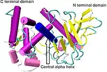 Thermolysin has a molecular weight of 34,600 Da. Its overall structure consists of two roughly spherical domains with a deep cleft running across the middle of the molecule separating the two domains. The secondary structure of each domain is quite different, the N-terminal domain consists of mostly beta pleated sheet, while the C-terminal domain is mostly alpha helical in structure. These two domains are connected by a central alpha helix, spanning amino acids 137-151.[7]