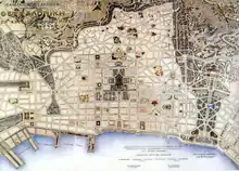 Most of the old center of the city was destroyed by the Great Thessaloniki Fire of 1917, which was started accidentally by an unattended kitchen fire on 18 August 1917.[134] The fire swept through the centre of the city, leaving 72,000 people homeless; according to the Pallis Report, most of them were Jewish (50,000). Many businesses were destroyed, as a result, 70% of the population were unemployed.[134] Two churches and many synagogues and mosques were lost. Nearly one-quarter of the total population of approximately 271,157 became homeless.[134] Following the fire the government prohibited quick rebuilding, so it could implement the new redesign of the city according to the European-style urban plan[9] prepared by a group of architects, including the Briton Thomas Mawson, and headed by French architect Ernest Hébrard.[134] Property values fell from 6.5 million Greek drachmas to 750,000.[135]