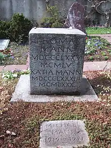 Following his 80th birthday, Mann went on vacation to Noordwijk (the Netherlands). On 18 July 1955, he began to experience pain and unilateral swelling in his left leg. The condition of thrombophlebitis was diagnosed by Dr. Mülders from Leiden and confirmed by Dr. Wilhelm Löffler. Mann was transported to a Zürich hospital, but soon developed a state of shock (circulatory). On 12 August 1955, he died.[16] Postmortem, his condition was found to have been misdiagnosed. The pathologic diagnosis, made by Christoph Hedinger, showed he had actually suffered a perforated iliac artery aneurysm resulting in a retroperitoneal hematoma, compression and thrombosis of the iliac vein. (At that time, lifesaving vascular surgery had not been developed.[16]) On 16 August 1955, Thomas Mann was buried in Village Cemetery, Kilchberg, Zürich, Switzerland.[17]