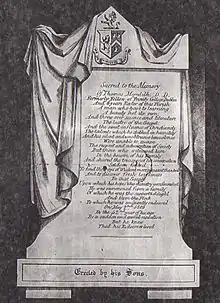 The poet, Charles Wolfe, was much attached to, and a great admirer of Thomas Meredith. He was the Curate of nearby Donaghmore, County Tyrone and a frequent guest of the Merediths at Ardtrea.[6] Chiefly remembered today for his poem The Burial of Sir John Moore after Corunna, brought to the attention of the public by Lord Byron, Wolfe was also the author of the inscription on Meredith's memorial at the Church of Ardtrea and a previously unpublished epitaph for his tomb. The memorial is made of black and white marble and is surmounted by the Meredith family crest and coat of arms: