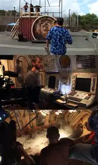 Jack Bender stated that Matthew Fox "really commits body and soul into the story he's telling" and Fox questioned whether he had ever been more tired than while shooting the double episode.[35] Like the other Lost season finales, the final cliffhanger scene was given a codename—"The Rattlesnake in the Mailbox"—and kept top secret.[36] After Lindelof and Cuse wrote the scene, only Fox, Lilly, Bender, and co-executive producer Jean Higgins were given copies of the script. The scene was shot with a green screen in an abandoned Honolulu parking lot with the airport edited in.[37] Despite the security measures, a complete and detailed episode synopsis was uploaded online over a week before the episode aired.[38] Disney investigated the leak.[39] The leak prompted Lindelof and Cuse to enter "radio silence", which was temporarily broken at Comic-Con International 2007.[40] The funeral parlor that Jack visits is called "Hoffs/Drawlar", which is an anagram of "flashforward".[41] The idea of flashforwards was conceived by creators Lindelof and Abrams during the show's conception.[42] However, Cuse and Lindelof only started fleshing out the idea at the end of the first season, after they realized that flashbacks would eventually stop being revelatory and knew that they would eventually have to switch to flashforwards.[43] With the announcement that the series would conclude 48 episodes after "Through the Looking Glass",[44] they felt comfortable playing flashforwards as early as the third-season finale.