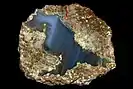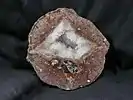 A thunderegg (or thunder egg) is a nodule-like rock, similar to a filled geode, that is formed within rhyolitic volcanic ash layers.[1] Thundereggs are rough spheres, most about the size of a baseball—though they can range from a little more than a centimeter to over a meter across. They usually contain centres of chalcedony which may have been fractured followed by deposition of agate, jasper or opal,[1] either uniquely or in combination. Also frequently encountered are quartz and gypsum crystals, as well as various other mineral growths and inclusions. Thundereggs usually look like ordinary rocks on the outside, but slicing them in half and polishing them may reveal intricate patterns and colours. A characteristic feature of thundereggs is that (like other agates) the individual beds they come from can vary in appearance, though they can maintain a certain specific identity within them.