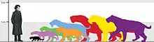 Body mass for sparassodonts is difficult to estimate, since these animals have relatively large heads in proportion to their bodies, leading to overestimations, particularly when compared with skulls of modern members of Carnivora, which have different locomotory and functional adaptations, or with those of the recent predatory marsupials, which do not exceed 30 kg of body mass. Recent methods, like Ercoli and Prevosti's (2011) linear regressions on postcranial elements that directly support the body's weight (such as tibiae, humeri and ulnae), comparing Thylacosmilus to both extinct and modern carnivorans and metatherians, suggest that it weighed between 80 to 120 kilograms (180 to 260 lb),[12][13] with one estimate suggesting up to 150 kg (330 lb),[14] about the same size as a modern jaguar. The differences in weight estimations may be due to the individual size variation of the specimens studied in each analysis, as well as the different samples and methods used. In any case, the weight estimations are consistent for terrestrial species that are generalists or have some degree of cursoriality.[13] A weight in this range would make Thylacosmilus one of the largest known carnivorous metatherians.