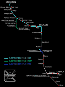 In 1916, the railway was extended to Turlock, California, and in 1917 to Hilmar, California. The lines to Turlock and Hilmar split at a junction known as Hatch, California. This portion was never electrified and never operated passenger service, being purely for freight. A freight-only branch to Manteca, California was constructed in 1918. While many references list this branch as being unelectrified, evidence from the TS mechanical department and the Western Pacific's accounting files show that the line did in fact have overhead wire and was operating with electric locomotives.