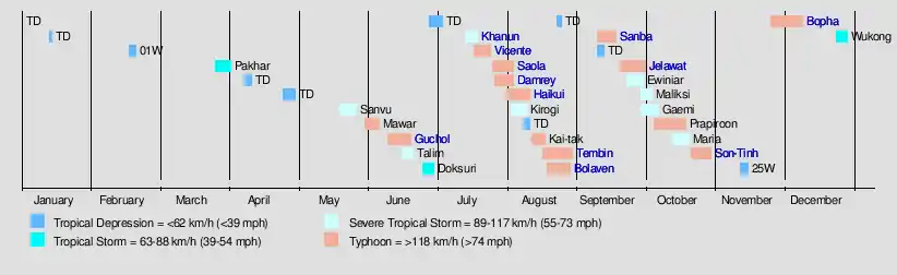 For the PAGASA, 17 systems formed or entered in area of responsibility during 2012, which 7 of them directly made landfall over the Philippines. The season started by the formation of a depression on January 13, but the JMA reported that the season had started on January 1 by a tropical depression which formed on December 31, 2011. 7 typhoons underwent rapid deepening. From late August to September, three very powerful typhoons, Bolaven, Sanba and Jelawat, directly hit Okinawa Island successively. In October, the remnants of Severe Tropical Storm Gaemi arrived at the Bay of Bengal and re-intensified into a deep depression before making landfall over Bangladesh.