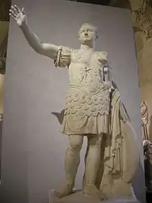 Decades of civil war during the 1st century BC had contributed greatly to the demise of the old aristocracy of Rome, which was gradually replaced in prominence by a new provincial Italian nobility during the early 1st century.[3] One such family was the gens Flavia, which rose from relative obscurity to prominence in only four generations, acquiring wealth and status under the Emperors of the Julio-Claudian dynasty. Titus's great-grandfather, Titus Flavius Petro, had served as a centurion under Pompey during Caesar's Civil War. His military career ended in disgrace when he fled the battlefield at the Battle of Pharsalus in 48 BC.[4]