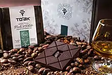 The company's products include the Vintage 2014 edition that was aged for three years in a French oak cognac cask.[21] The company ages bars in wood casks and empty spirit casks.[22][23] They have been described as a "boundary-pushing chocolate company"[24] for launching a bar of dark chocolate that has been aged for 18 months in a 50-year-old Cognac cask.[25][26][27] They have also aged chocolate for two years in a Laphroaig Islay whisky cask.[28][29][30]