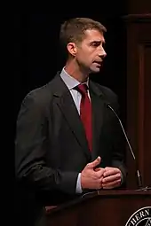 On August 6, 2013, Cotton officially announced he would challenge Democratic incumbent Mark Pryor for his seat in the United States Senate.[48] Stuart Rothenberg of Roll Call called Pryor the most vulnerable Senator seeking re-election.[49] Cotton was endorsed by the conservative Club for Growth PAC,[50][51][52] Senator Marco Rubio,[53] the National Federation of Independent Business,[54] and former presidential candidate Mitt Romney, who campaigned for Cotton.[55][56] The Associated Press called the race for Cotton immediately after the polls closed;[57] he prevailed by a margin of 56.5%-39.4%.[58] Cotton was sworn into office on January 6, 2015.[59]