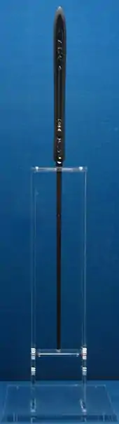 The weapon, along with Nihongō and Otegine, is listed as one of "three great spears" in the Kyōhō Meibutsucho, a listing of famous Koto blades made before the Nanbokucho period and compiled by the Hon'ami family during the Kyōhō era (1716–1735).[1]