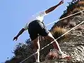 Top rope climbing (or top roping) is a style in climbing in which the climber is securely attached to a rope which then passes up, through an anchor system at the top of the climb, and down to a belayer at the foot of the climb. The belayer takes in slack rope throughout the climb, so that if at any point the climber were to lose their hold, they would not fall more than a short distance.[1]