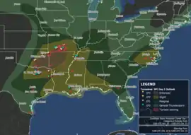![]() Map of tornado warnings and confirmed tornadoes from the outbreak | |
