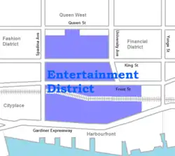 The Toronto Entertainment District is an area in downtown Toronto, Ontario, Canada. It is concentrated around King Street West between University Avenue and Spadina Avenue. It is home to theatres and performing arts centres, the Toronto Blue Jays, and an array of cultural and family attractions. The area is also home to most of the nightclubs in downtown Toronto.
