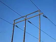 In countries such as Canada or the United States, wooden towers carry voltages up to 345 kV; these can be less costly than steel structures and take advantage of the surge voltage insulating properties of wood.[4] As of 2012, 345 kV lines on wood towers are still in use in the US and some are still being constructed on this technology.[5][6] Wood can also be used for temporary structures while constructing a permanent replacement.