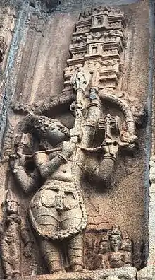 Tripurantaka or Tripurari is a manifestation of the Hindu god Shiva. In this aspect, Shiva is depicted with four arms wielding a bow and arrow, but different from the Pinakapani murti. He holds an axe and a deer on the upper pair of his arms. In the lower pair of the arms, he holds a bow and an arrow respectively. After destroying Tripura, Tripurantaka Shiva smeared his forehead with three strokes of Ashes. This has become a prominent symbol of Shiva and is practiced even today by Shaivites.