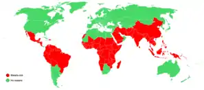 In developing countries alone, 22 million people are living with HIV. Most infections are still in Africa, but Europe, Asia, Latin America, and the Caribbean are now seeing large numbers of infections as well.[6][7] 95% of expected new infections will occur in the low income countries in the tropics.[8][7] The expected number of new infections is 3-4 million per year.[7] Risk factors such as needle use and unprotected sex are much more prevalent in tropical and underdeveloped areas. Once HIV is transmitted to a tropical area it is spread throughout the sexually active population. Though how fast and how far it spreads varies, some African countries have an HIV prevalence of 10%. More alarming still, in urban areas, prevalence among pregnant women can get as high as 30%. Healthcare professionals themselves are at great risk of exposure to HIV. An HIV prevalence of 10% means any given workforce will also have a 10% prevalence, and this does not exclude the healthcare team.[7] Tuberculosis is thought to cause a more rapid disease progression. Tuberculosis is prevalent in tropical and under-developed countries, only making HIV more devastating.[9] Without the expensive and high-tech medical equipment of developed, western countries, physicians in the tropics are left with few options. If they are able to catch an HIV-related bacterial or mycobacterial disease they can diagnose and manage the disease with basic drugs and standard treatment protocol. Many under-developed countries do not have a care strategy, and of those that do, they aren't as effective as they need to be to stop the spread of HIV.[7]