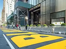In July 2020, activists including New York City mayor Bill de Blasio painted the words "Black Lives Matter" in giant letters on Fifth Avenue directly in front of the building.[144][145] The project was announced in response to the George Floyd protests in New York City, a series of pro-police-reform protests that started after the killing of George Floyd, a black man in Minneapolis, in May 2020. Trump expressed his opposition to the mural after it was announced.[146]