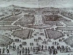 The garden of Catherine de' Medici was an enclosed space five hundred metres long and three hundred metres wide, separated from the new palace by a lane. It was divided into rectangular compartments by six alleys, and the sections were planted with lawns, flower beds, and small clusters of five trees, called quinconces; and, more practically, with kitchen gardens and vineyards.[2]