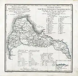 The Captaincy of Tukums (German: Hauptmannschaft Tuckum) was founded in 1617 as a subdivision of the Duchy of Courland and Semigallia. In 1795, the Duchy was incorporated into the Russian Empire, and in 1819 Tuckum County (Kreis Tuckum) became one of the ten counties of the Courland Governorate.