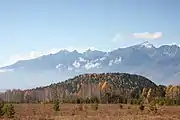The geography of the Tunkinsky region includes dramatic scenery (the "Tunka Alps") of rift and glacial valleys and mountains, hot springs, mountain meadows, waterfalls, and many associated habitats. The park is found at a meeting point of tiaga, steppe, alpine forest and lake ecosystems. Tunkinsky, and the Tunka Valley it encompasses, lies between the two great lakes of Siberia - Lake Baikal and Lake Hovsgol.[2][3] Heights of the mountains range from 668 metres (2,192 ft) to 3,172 metres (10,407 ft).[4] The central valley of the Irkut is flat with fertile soil well suited to agriculture. There are a number of small settlements in the valley, mostly inhabited by the indigenous Siberian Buryat people.[5]