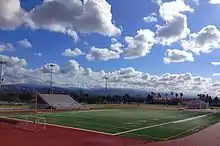 Tustin High School is located on 29 acres of land in the middle of the city of Tustin. Today's campus consists of 22 single-story buildings, a two-story science building and 17 portable classrooms. The campus includes two baseball fields, two softball fields, a discus field and two gymnasiums. It also houses the District football field, an Olympic-sized swimming pool, two soccer fields, six tennis courts and a synthetic track and field.[6]