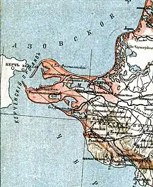 The Tuzla Spit formed the southern shore of the Taman Bay; the northern shore is the Chushka Spit.