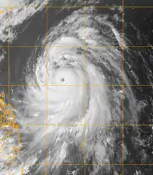 Rammasun continued to intensify and was designated as a severe tropical storm late on May 8.[10] The next day both the JMA and the JTWC reported that Rammasun had intensified into a typhoon.[11][12] Later that day the JTWC reported that the typhoon had rapidly intensified within the last six hours and had become a Category 3 typhoon on the Saffir–Simpson hurricane wind scale.[13] At the same time the JMA were reporting that Rammasun had winds of 150 km/h (90 mph).[14] The typhoon then continued to intensify quickly with the JMA reporting that Rammasun had winds of 160 km/h (100 mph), the JTWC then reported that Rammasun had become a Category 4 typhoon with winds of 225 km/h (140 mph).[15][16] Later that day both the JMA and the JTWC reported that the typhoon had reached its peak winds. The JMA reported peak winds of 195 km/h (120 mph) whilst the JTWC reported that Rammasun had peak winds of 250 km/h (155 mph), making it a category 4 super typhoon.[17][18] Typhoon Rammasun's minimum pressure was officially estimated at 915 hPa which tied with Intense Tropical Cyclone Hondo as second strongest storm of 2008.[18][19]