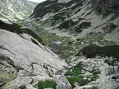 A glacial trough or glaciated mountain valley often ends in an abrupt head known as the 'trough end' or 'trough head'.[9] This may have almost sheer rock walls and spectacular waterfalls.[9][10] They are believed to have been formed where a number of small glaciers merge to produce a much larger glacier.[9] Examples include: Warnscale Bottom in the Lake District, Yosemite Valley, and the Rottal and Engstlige valleys in Switzerland.[9][10]