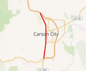 U.S. Route 395 Business (US 395 Bus.) is a business route of US 395 in Carson City, Nevada. The route provides access to downtown Carson City from Interstate 580 (I-580). The route was originally part of mainline US 395 before it was realigned around Carson City along I-580. Although still signed as US 395 Business, the route is no longer part maintained by the Nevada Department of Transportation (NDOT) and the ownership has been transferred to Carson City.