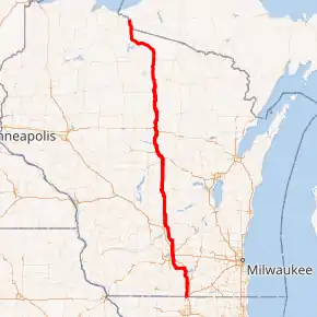 U.S. Highway 51 (US 51) in the U.S. state of Wisconsin runs north–south through the central part of the state. It enters from Illinois at Beloit, and runs north to its northern terminus in Hurley where it meets US 2. Much of the route of US 51 runs concurrently with Interstate 39 (I-39).