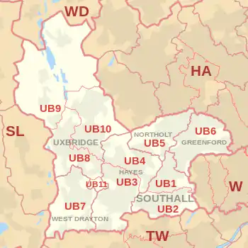 The UB postcode area, also known as the Southall postcode area,[2] is a group of eleven postcode districts in England, within six post towns. These cover parts of western and north-western Greater London, plus a very small part of Buckinghamshire. The letters in the postcode are derived from an abbreviation of Uxbridge.